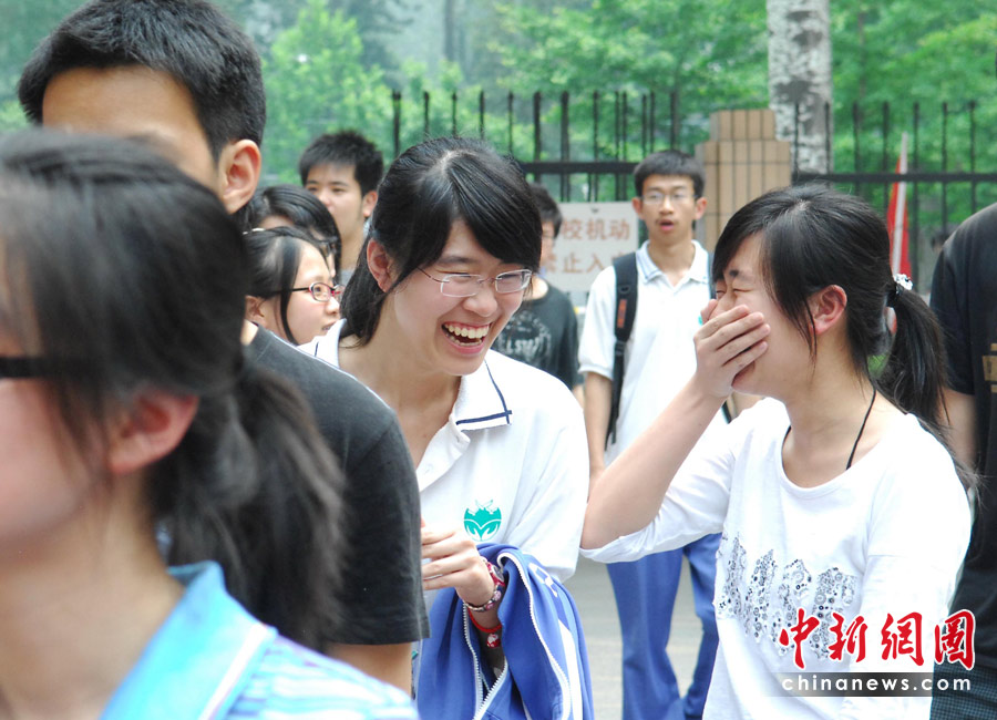 6月7日,為期兩天的2010年普通高等學(xué)校招生全國(guó)統(tǒng)一考試開考,全國(guó)將有957萬考生走進(jìn)考場(chǎng)。圖為學(xué)生走出考場(chǎng)后相互交流心得。中新社發(fā) 侯宇 攝