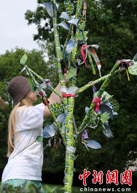 當地時間2010年6月6日,英國倫敦舉行卡姆登綠色市集(Camden Green Fair),這是英國倫敦每年環保領域的“重頭戲”。本屆市集的主旨是要喚起大眾對環境問題的關注,選擇更加可持續發展的生活方式。據活動主辦方預計,本屆市集將吸引來自英國各地和世界各國的2萬多人參加。圖為用回收的廢舊紙張制作的“小樹”。該樹由年輕的倫敦園藝設計師Sarah Veniard設計。她的設計理念是“美麗的可持續空間”。她認為只要有充足的陽光,陽臺也可以變成一個集水果蔬菜和觀賞植物于一身的多功能花園。Sarah是純素食主義者,她結合顧客要求設計的瓜果園非常受歡迎。Fiona/攝 Fiona 馬小剛/文
