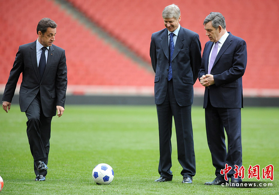 圖為2008年3月27日,法國總統(tǒng)薩科齊來到倫敦酋長球場,在英國首相布朗和英超勁旅阿森納隊(duì)主教練溫格面前“秀”了一下腳法。