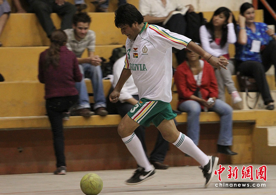 圖為2009年11月1日,玻利維亞總統(tǒng)莫拉萊斯當(dāng)日在拉巴斯代表玻利維亞總統(tǒng)隊(duì)和巴西大使館隊(duì)踢了一場(chǎng)足球比賽。結(jié)果玻利維亞總統(tǒng)隊(duì)以10-2的比分獲勝。