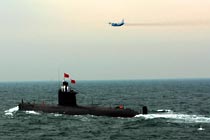 4月23日下午,為紀(jì)念中國人民解放軍海軍成立60周年而舉行的海上閱兵在青島附近黃海海域舉行。長征6號(hào)、長征3號(hào)核動(dòng)力潛艇和長城218號(hào)、長城177號(hào)常規(guī)動(dòng)力潛艇依次接受檢閱。 中新社發(fā) 宋吉河 攝
