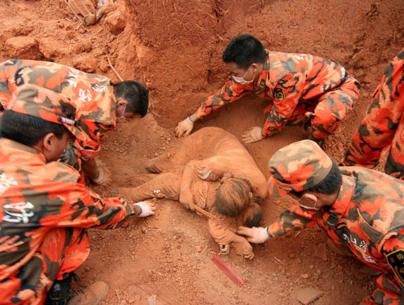 2008年8月30日16時30分,四川攀枝花市、會理縣交界處發(fā)生6.1級地震,造成36人死亡,675人受傷。圖為消防官兵在倒塌的土墻下刨出兩名罹難者的遺體。作者:鄒森 中國