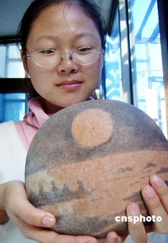 10月28日拍攝的天然奇石“嫦娥奔月”。當日,蘇州顧小姐展示一塊“嫦娥奔月”的黃河石,該石呈扁圓狀,寬34厘米、高40厘米,平滑的表面有一個直徑大約5厘米的圓,呈黃色,像一輪滿月。中新社發 李俊鋒 攝