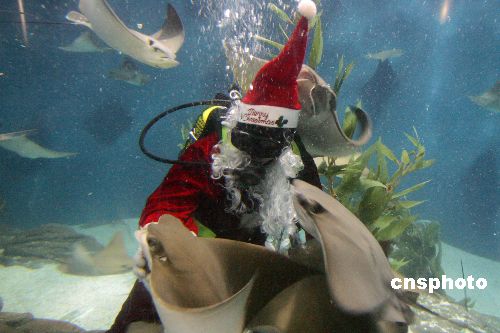 12月13日,上海海洋水族館上演“圣誕老人”海底喂食秀,由潛水員裝扮的圣誕老人在水下進行喂食表演,吸引了眾多游人好奇的目光。中新社發 湯彥俊 攝