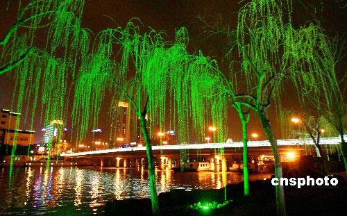 3月17日晚,蘇州環城河邊楊柳與建筑物在景觀燈的映照下格外迷人。陽春三月,當夜幕降臨后的蘇州環城湖畔,排列成行的絲絲垂柳在景觀照明燈下,霓裳艷影,水上游船、古橋和兩岸建筑物相映成輝,璀璨奪目,景色迷人。中新社發 蘇秀 攝