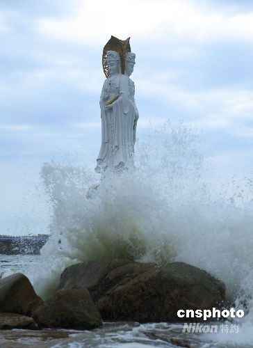 2008年9月24日下午,受強臺風(fēng)“黑格比”影響,海南三亞市南山風(fēng)景區(qū)海灘驚濤拍岸,從掀起的巨浪前遠觀108米高的南海觀音圣像,恰似觀音踏浪歸來。中新社發(fā) 宋建春 攝