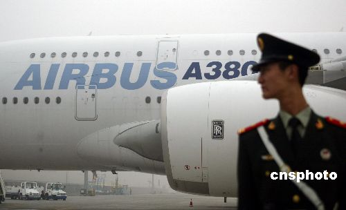 10月26日,生產編號為007的空中客車A380客機停靠在北京首都國際機場N104機位,接待北京媒體及部分嘉賓的參觀。此次A380中國大陸之行為期一周,包括廣州、上海及北京三個城市,這是A380飛機2007年環球飛行之旅的重要部分。當日因北京的大霧天氣,空中客車公司取消了A380北京體驗飛行的計劃,但將繼續其在中國大陸之行最后一站的展示活動。中新社發 楊可佳 攝