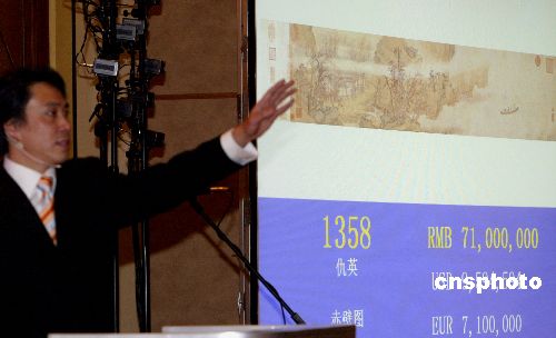 11月6日晚,中國嘉德2007秋季拍賣會(huì)的國寶級(jí)拍品明代仇英《赤壁圖》,最終以7952萬元人民幣(含傭金)的天價(jià)成交,創(chuàng)下中國繪畫作品(包括所有中國書畫和油畫作品)拍賣的世界紀(jì)錄。據(jù)悉,該作品由中國內(nèi)地買家競(jìng)得。此幅作品受到藏家的極大關(guān)注,拍賣現(xiàn)場(chǎng)氣氛非常熱烈,拍賣師報(bào)出4000萬元人民幣的起價(jià)后,隨即就有買家舉牌應(yīng)價(jià)。此后,現(xiàn)場(chǎng)買家與委托席叫價(jià)此起彼伏,競(jìng)價(jià)不斷飆升,爭(zhēng)奪趨于白熱化,最終以7100萬元人民幣的價(jià)格落槌。中新社發(fā) 張煒 攝