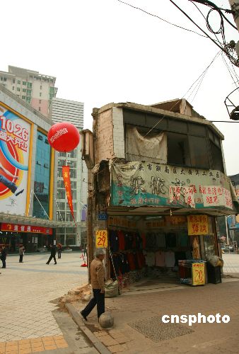 11月13日,在長沙人流如潮的黃金地段南門口,一家商廈廣場上挺立著一座陳舊的房子。據了解,從2005年項目啟動拆遷到現在,這個“釘子戶”已經堅持了近三年。中新社發 趙晶 攝