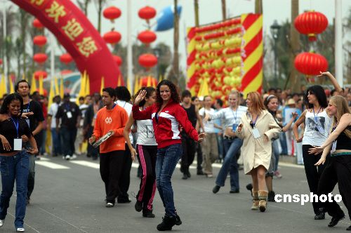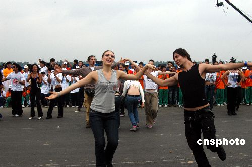 2007年11月16日,外國朋友在海南瓊海跳起歡樂之舞。為期三天的第八屆中國海南歡樂節將于當天下午開幕,海南全省放假一天。當天上午,出席開幕式的各國朋友和海南各族群眾在歡樂節主會場情不自禁地跳起歡樂之舞。中新社發 蒙鐘德 攝