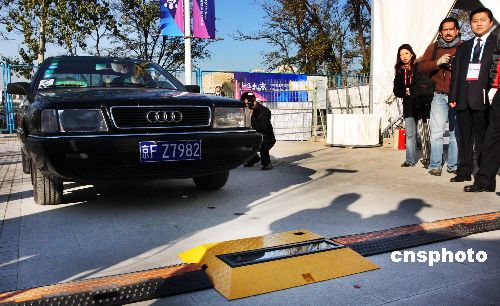 11月16日,北京奧運場館安保工作面向境內外記者開放,一百余位記者在2008奧運柔道賽館——北京科技大學體育館體驗了快速車檢和人身安檢。北京奧運安保協調小組辦公室常務副主任、奧運安保指揮中心常務副總指揮劉紹武在現場介紹,一部X光機和兩部安檢門為一套系統,在一小時內可完成對八百名觀眾的安全檢驗,平均不到五秒鐘可放行一人。中新社發 鄭雄增 攝