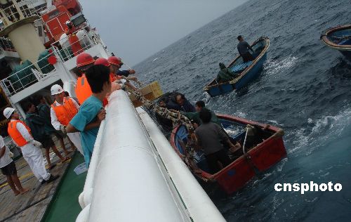 圖為被困中外漁民在接受中國救助船舶的救援。中新社發 瓊芬 攝