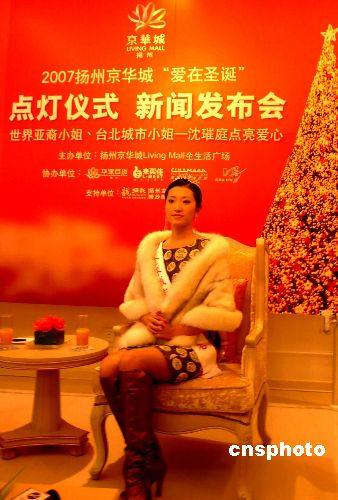11月30日,揚(yáng)州舉辦“愛在圣誕”點(diǎn)燈儀式及中國麥田計劃獻(xiàn)愛心新聞發(fā)布會。世界亞裔小姐、臺北城市小姐沈璀庭出席,并將于12月1日晚在揚(yáng)州京華城廣場為21米高的巨型圣誕樹啟動“愛在圣誕”點(diǎn)燈儀式,并與“中國麥田計劃”愛心慈善團(tuán)體攜手獻(xiàn)愛心。“中國麥田計劃”于2005年成立,是一個為貧困地區(qū)兒童建立圖書室、捐贈衣物及創(chuàng)造讀書機(jī)會的民間志愿組織。中新社發(fā) 崔佳明 攝