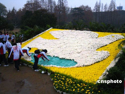 2007年12月13日是“南京大屠殺”70周年紀(jì)念日。12月12日,南京人民為寄托對南京大屠殺遇難同胞的衷思,他們用菊花在南京玄武湖環(huán)湖路明鏡廣場組成一只巨型和平鴿。“和平鴿”面積達(dá)70平方米,象征南京大屠殺遇難同胞70周年忌日;用25550支菊花,寄托著70周年的25550天對遇難同胞的哀思;振翅起飛的和平鴿,寓意中國人民向往和平的美好心愿。圖為一群學(xué)生在用菊花拼和平鴿。中新社發(fā) 谷昌旺 攝