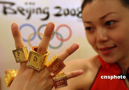 十二月十九日,由北京繁榮文化發展有限公司推出的五十余款奧運紀念章與消費者見面,此舉使得北京奧運特許商品這一大家族又增添了“新成員”。這些限量發行的“新成員”,多為大眾化商品,價格在一百元人民幣的就有二十多種,內容涉及不同題材,如體育、科技、文化、城市等,其中最吸引人的還是設計制作獨特的奧運金章玉璧等高端商品。中新社發 任海霞 攝