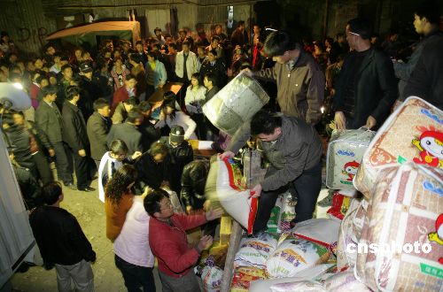 圖為一月十四日晚,惠州市為災民發放慰問品現場。一月十三日上午,在廣東惠州市區河南岸街道辦事處河南岸村渡船頭村民小組面積過萬平方米的一片棚屋發生火災,造成三百多名來自河南、安徽等地的種菜和收廢品的外來民工受災;馂陌l生后,惠州市委、市政府和惠城區委、區政府以及河南岸辦事處立即妥善安置了災民的生活。中新社發 宋秀杰 攝