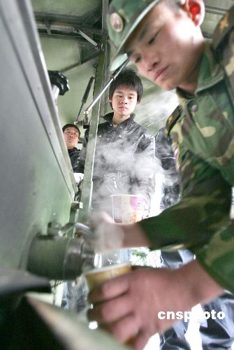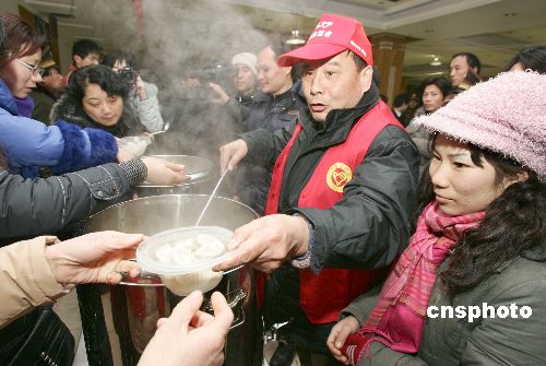 近期由于受大雪天氣影響導致國內大范圍的鐵路、公路交通受阻或中斷,使大批返鄉旅客滯留杭州火車站、杭州火車東站和市區各大長途汽車站,從1月27日起,杭州市開辟了部分劇院、大廈、會展中心、體育館等公共場所及搭建軍用帳篷等作為滯留旅客的臨時駐留點。至1月30日下午,已先后接待了近10萬人次的滯留旅客,當地的政府部門、企事業單位、部隊、公安、街道、衛生、共青團、市民志愿者等紛紛行動起來,按照“有水喝、有飯吃、有地方安頓、生病有醫治、困難群眾有救助”的要求,以各種形式盡力為所有滯留旅客提供生活保障和溫馨服務。 中新社發 李忠 攝