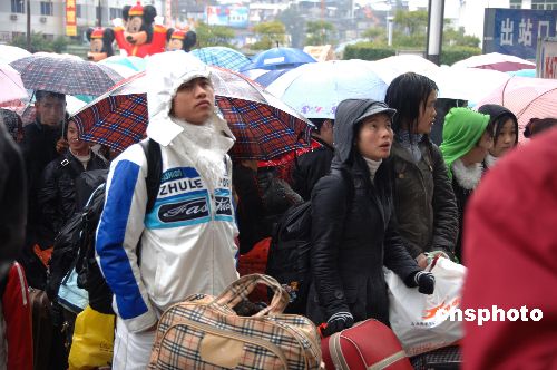 1月31日,寒雨中在福州火車站等候開往武昌、南昌、合肥、重慶、吉安、九江、武夷山等七趟列車的旅客,關注著車站的公告。當天,除上述從福州始發的列車取消運行外,尚有多趟列車開行。中新社發 鄭祚聲 攝
