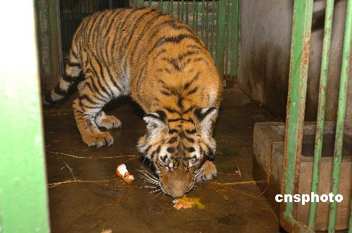 2月4日,在南昌動物園,華南虎“明明”正津津有味吃著飼養(yǎng)員送來的新鮮豬肉。“明明”(原名華華)出生于上海,其父是南昌動物園寄養(yǎng)在上海的雄性虎。它約半歲時運(yùn)回南昌,與成年虎相比,這只小華南虎特別活潑好動,惹人喜愛。由于患有雙目先天性白內(nèi)障,小虎走路時經(jīng)常碰壁,并且總是憑嗅覺發(fā)現(xiàn)食物。1月27日,南昌大學(xué)二附院眼科專家為小華南虎成功實施國內(nèi)首例華南虎白內(nèi)障摘除術(shù)。經(jīng)過一個星期的術(shù)后恢復(fù),情況良好的小華南虎被送往籠舍重新恢復(fù)與游客見面。為紀(jì)念小華南虎獲得健康視覺,南昌動物園將華南虎“華華”更名為“明明”。中新社發(fā) 朱文標(biāo) 攝
