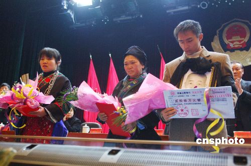 2月4日,貴州省委、省政府召開電視電話會議,表彰抗雪災(zāi)犧牲在崗位上的民警歐光權(quán)。歐光權(quán)是貴州省臺江縣看守所民警,在抗雪災(zāi)一線超負荷工作,1月21日因積勞成疾突發(fā)腦溢血倒在崗位上,經(jīng)搶救無效光榮犧牲,終年57歲。2月2日,公安部部長孟建柱簽署命令,追授歐光權(quán)為全國公安二級英模。表彰會上有關(guān)領(lǐng)導(dǎo)一次性向歐光權(quán)的家屬頒發(fā)獎金21萬元。中新社發(fā) 吳東俊 攝