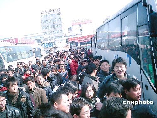 2月4日,安徽省合肥長途汽車站迎來雪后恢復運行的第一個短途客運高峰。由于久雪之后天氣放晴,加上臨近年關,合肥長途汽車站內旅客激增,當日大約有2萬多名乘客擁擠在該站車站內,排成一條條“長龍”。中新社發 張發平 攝