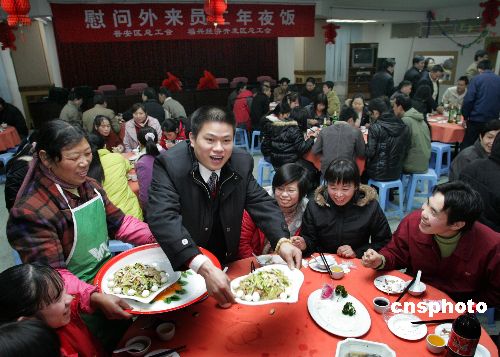 2月4日晚,在福州市福興投資區(qū)務(wù)工的老陳喜洋洋地在食堂端上熱騰騰的美食,和工友一起提前吃上了一頓豐盛的年夜飯。老家湖南的他今年因暴雪無(wú)法回家過(guò)年,據(jù)了解,福州僅晉安區(qū)像老陳這樣的滯留外來(lái)工有5000多人,當(dāng)?shù)卣凸?huì)組織近期陸續(xù)為區(qū)內(nèi)滯留外來(lái)工準(zhǔn)備了600余桌的年夜飯,讓不能回家的農(nóng)民工兄弟感受到在福州過(guò)年的溫暖。中新社發(fā) 包華 攝