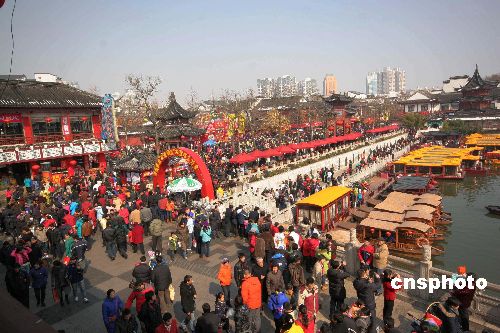 2月7日,南京夫子廟游人如織,人們看花燈、品小吃,參與多種娛樂活動,在歡樂祥和的氣氛中喜度新春佳節。中新社發 文寶 攝