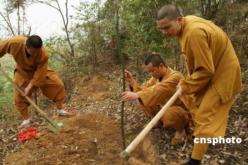 3月12日中國(guó)植樹節(jié),廣東南海西樵山寶峰寺的僧侶在西樵山國(guó)家森林公園參加植樹造林。有珠江西岸文明燈塔之稱的廣東南海西樵山國(guó)家森林公園,經(jīng)過(guò)多年植樹造林,森林覆蓋率已達(dá)到90%以上。中新社發(fā) 孫建駒 攝
