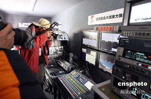 4月30日,采訪2008北京奧運會火炬接力珠峰展示活動的中外媒體記者,集體探訪珠峰大本營,首次進入中國中央電視臺(CCTV)設(shè)置在珠峰大本營的電視直播間和電視直播車。中新社發(fā) 盛佳鵬 攝