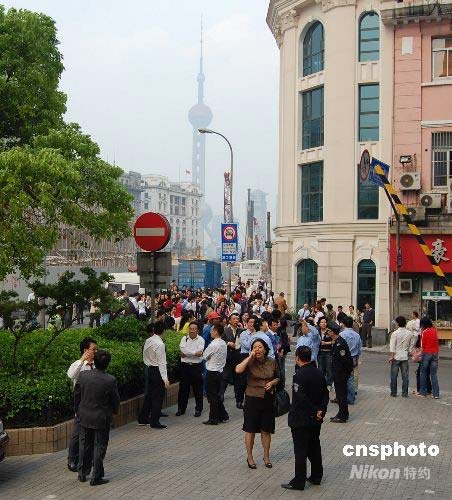 據上海市地震局剛剛提供的消息,中國地震臺測定,5月12日14時28分在四川汶川縣發生7.8級地震,上海高層建筑普遍有感,但不會對上海造成危害。圖為位于市中心35層的上海工商聯大廈樓前聚集的慌忙跑出的人群。中新社發 段更強 攝