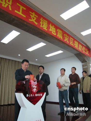 5月12日四川發生強烈地震后,遼寧民眾情牽災區。從5月14日開始,遼寧各企事業單位干部和職工紛紛踴躍捐款,支援四川抗震救災。圖為14日上午,遼寧省民政廳300余名干部和職工熱心捐款。中新社發 沈殿成 攝