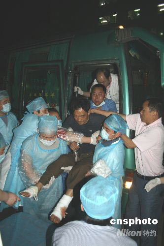5月15日23時,又一批90名從地震重災(zāi)區(qū)四川綿竹市的傷員,被連夜運到眉山市第二人民醫(yī)院,當(dāng)?shù)蒯t(yī)務(wù)人員、青年志愿者和剛剛趕到這里增援的吉林省醫(yī)療隊等數(shù)百人齊心協(xié)力,經(jīng)過1個小時的奮斗后把這批傷員安置到病房,并立即展開救治。中新社發(fā) 堯遙 攝