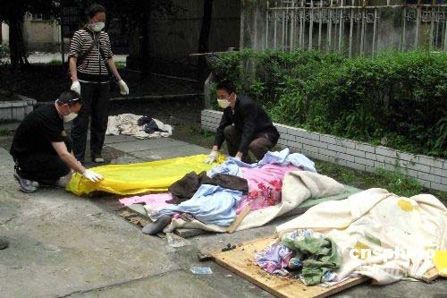 2008年5月16日,四川都江堰市蒲陽路附近一個小區,死者家屬在肅穆氣氛中為死者準備出殯事宜,死亡者未能避開5月12日中國汶川大地這場劫難,其遺體剛從地震廢墟中刨出。中新社發 鄒憲 攝