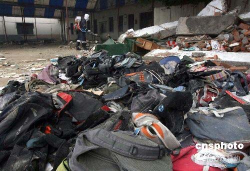 圖:疾控人員對殘留的書包噴灑消毒藥