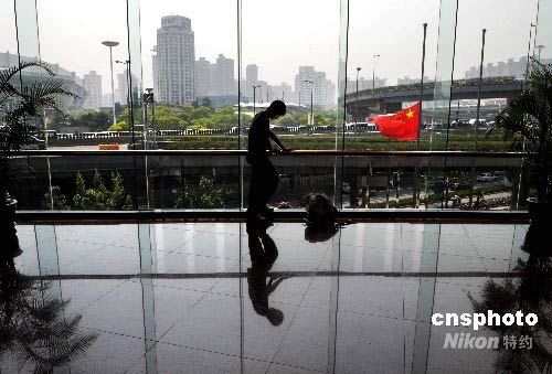 5月19日,上海徐匯區一所建筑內,一名青年面對窗外降半旗的國旗沉思。為表達各族人民對四川汶川大地震遇難同胞的深切哀悼,中國政府決定,2008年5月19日至21日為全國哀悼日。在此期間,全國和各駐外機構下半旗志哀,停止公共娛樂活動,外交部和中國駐外使領館設立吊唁簿。5月19日14時28分起,全國人民默哀3分鐘,屆時汽車、火車、艦船鳴笛,防空警報鳴響。中新社發 廖攀 攝