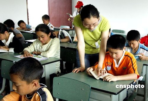 5月19日,來自地震重災區的孩子在四川省成都市新都區“愛心學校”的課堂上接受老師輔導。全國首所專門為地震重災區孩子開辦的“愛心學校”,18日上午在四川省成都市新都區新繁鎮正式開課。首批就讀的166名孩子,分別來自彭州、都江堰、綿竹等重災區,有的孩子在震災中失去了父母。新都區從各個學校抽調了近20名經驗豐富、有敬業精神和愛心的教師任課,并給學校安排了2名有資質的優秀心理健康輔導老師。