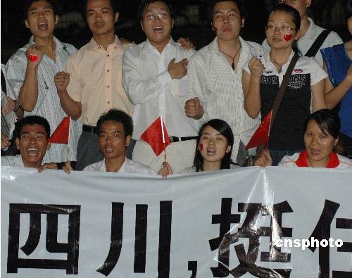 五月二十日晚,廣西南寧市民族廣場聚集了數千名“八零后”年輕人,他們喊出“四川,挺住”、“中國,加油”的口號,為四川汶川地震遇難者哀悼。中新社發 蔣雪林 攝