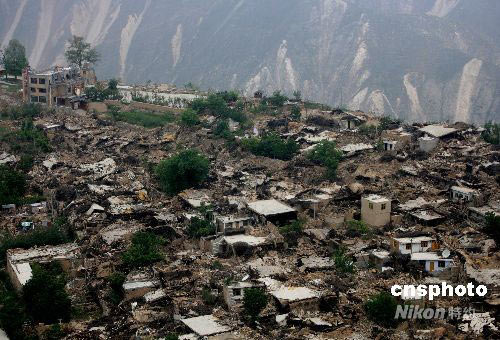 5月22日是汶川大地震第十一天,空中鳥瞰汶川縣城十余公里外的一座羌族山寨震后變為廢墟,令人慘不忍睹。 中新社發 賈國榮 攝