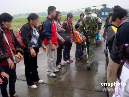 五月二十二日是汶川大地震第十一天,從地震災(zāi)區(qū)空運到成都避難的民眾都必須進行消毒處理。中新社發(fā) 賈國榮 攝
