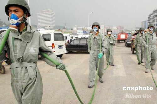 5月23日,中國空軍某部官兵在地震災區綿竹漢旺街頭展開消毒防疫。中新社發 陳文 攝