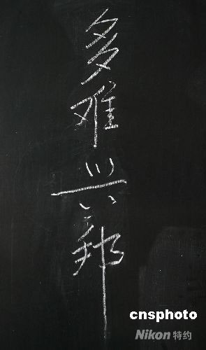 溫家寶總理5月23日在看望臨時安置在四川綿陽長虹培訓中心北川中學高三同學時,用粉筆在黑板上寫下的“多難興邦”四個大字。中新社發(fā) 蒲滔 攝