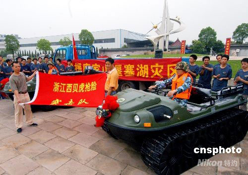 5月30日上午,浙江義烏,兩輛“西貝虎”水陸兩棲全地形車啟程前往四川北川唐家山堰塞湖搶險(xiǎn)。目前唐家山堰塞湖的總儲(chǔ)水量已達(dá)1.4億立方米,而且每天以500立方米的速度遞增,一旦發(fā)生潰壩,將危及下游130多萬人的生命財(cái)產(chǎn)。28日剛從什邡回來的義烏西貝文良特種車輛有限公司領(lǐng)導(dǎo),又接到唐家山堰塞湖防洪搶險(xiǎn)指揮部急需用水陸兩棲全地形車電話。該公司連夜組織加班,突擊生產(chǎn)了兩輛性能最優(yōu)的水陸兩棲全地形車,并根據(jù)唐家山堰塞湖搶險(xiǎn)可能遇到的困難,增配了自動(dòng)牽引鉤、牽引鋼絲繩、爬坡履帶、水上推進(jìn)的螺旋槳等。30日中午,陳根林等四名剛從什邡抗震救災(zāi)前線回來的公司職工,組成“西貝虎”搶險(xiǎn)突擊隊(duì),再赴抗震救災(zāi)前線搶險(xiǎn)。中新社發(fā) 張建成 攝