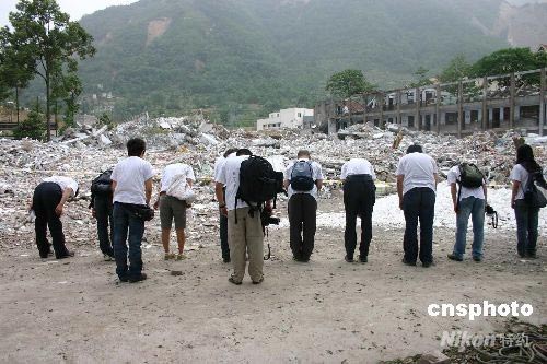 《中國新聞周刊》編輯記者在北川中學廢墟前默哀