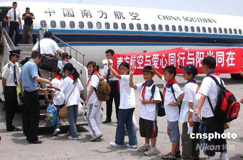 6月2日中午,成都雙流國際機場,89名來自北川、彭州、寶興、崇州等地震災區失去親人的兒童,乘坐南方航空海南分公司的愛心專機前往海南三亞,進行為期半個月的“愛心呵護、陽光行動”心靈呵護之旅。他們中年齡最大的16歲,最小的8歲。中新社發 尹海明 攝