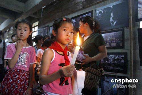 六月十二日,幾位孩子拿著蠟燭走進四川成都的汶川大地震博物館。當(dāng)日,中國首家汶川大地震博物館在四川成都建成開館,近4000件地震文物,1000余幅地震現(xiàn)場的照片,1000余幅地震死難者的照片墻持續(xù)震撼著觀展者的視覺。展覽以日記的形式,展現(xiàn)出從5月12日地震第一天到6月12日以來,每天發(fā)生的大事件。中新社發(fā) 慎重 攝
