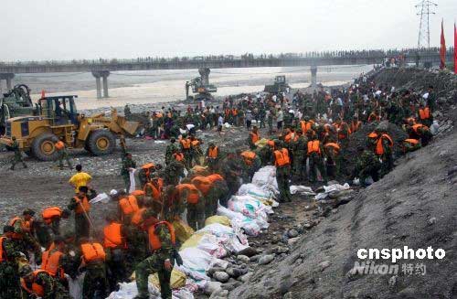 6月13日,在四川綿竹抗震救災的空降兵某部600多名官兵經過10個多小時的連夜奮戰,終于將綿遠河大堤因上游小崗劍堰塞湖爆破后形成洪峰沖垮的120多米潰口成功封堵。圖為河水迅速上漲,官兵們奮力搶筑大堤潰口。中新社發 李良泰宋超 攝