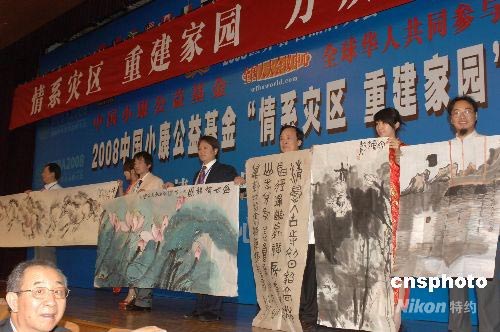 6月15日,百名畫家在北京全國人大會議中心出席2008中國小康公益基金“情系災區、重建家園”推動大會暨中國當代百名畫家賑災義捐獻愛心活動。該活動是由文化部中華社會文化基金會、中國小康公益基金、美中經貿投資總商會、世界著名品牌大會等單位共同主辦!爸袊】倒婊稹庇晌幕恐腥A社會文化發展基金會組建。中新社發 鄒憲 攝
