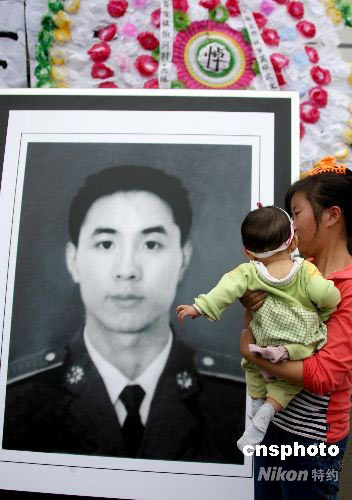6月21日,在都江堰市胥家鎮(zhèn)抗震英雄武文斌烈士的靈堂前,各地群眾敬獻的花圈已達兩千余個,數(shù)千民眾自發(fā)來到抗震英雄武文斌烈士的靈堂前進行悼念。26歲的濟南軍區(qū)“鐵軍”部隊炮兵指揮連二期士官武文斌,因連日救災(zāi)勞累,于6月18日4時45分犧牲。6月21日,濟南軍區(qū)某集團軍作出決定,為犧牲在抗震救災(zāi)第一線的某紅軍師實習士官學員武文斌追記一等功,并批準為烈士。中新社發(fā) 曾憲平 攝
