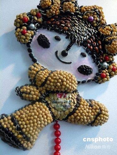 7月9日,為期一周的中國農民藝術展在北京落下帷幕。展覽突出“民俗風、鄉土韻、奧運情”三大元素,由鄉村工藝名家作品展、中國農民畫展、新中國農業宣傳畫展三個部分組成。剪紙、皮影、織繡、印染、風箏、布藝、編結(竹編、草編)、雕塑(根雕、蛋雕、木雕、泥塑、面塑)以及獨具特色的葫蘆藝術、蝴蝶藝術、插花藝術、茶具藝術、微縮傳統農具等作品在展覽上展出。圖為用豆子創作的奧運會福娃新穎別致。中新社發 錢興強 攝
