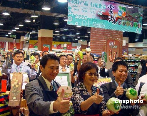 2008臺灣云林農(nóng)特產(chǎn)品北京展銷及貿(mào)易洽談會7月17日舉辦。圖為云林縣長、云林農(nóng)業(yè)合作社聯(lián)合社顧問蘇治芬(前排右二)與展銷團(tuán)成員在某百貨公司為農(nóng)特產(chǎn)品做促銷。中新社發(fā) 劉舒凌 攝